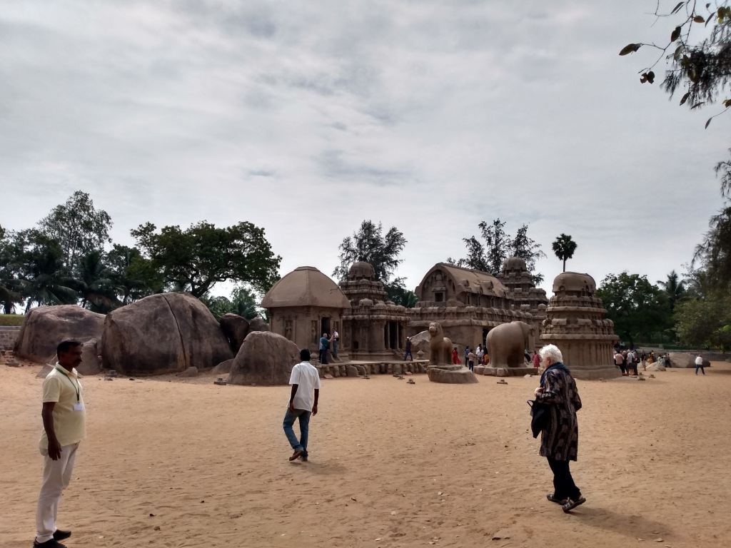 Our first day includes a visit on the way. Mahabalipuram’s historic sites include five carvings of temples from one massive piece of granite; another stone phenomenon of a giant ball seemingly about to roll downwards crushing all before – it’s been like this for hundreds of years, despite the Brits trying to pull it down using five elephants in the 1940’s; a small fort looking out over the nearby estuary, lake & ocean; and another ancient stone temple which survived the 2004 tsunami while all about it was flattened. Special place heh? And now it’s overrun by tourism.